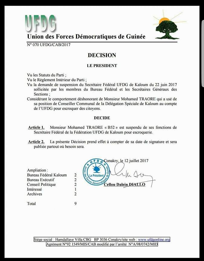Voici l'acte de suspension du responsable local de l'UFDG à Kaloum.