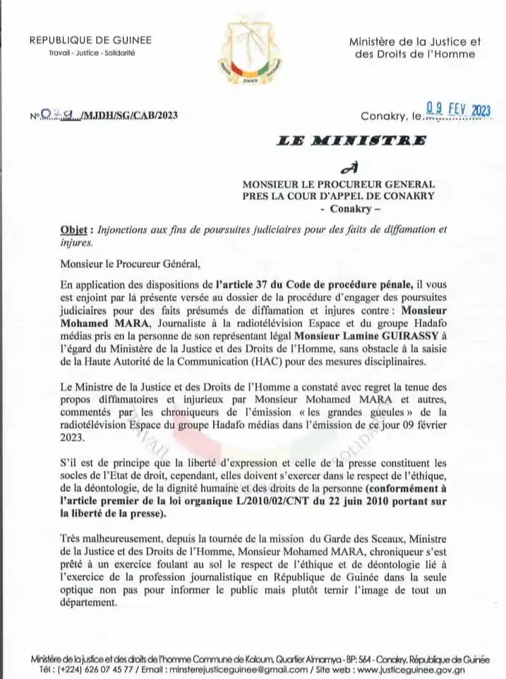 Lire ci-dessous la lettre que le ministre a adressée au Procureur de Conakry, à cet effet, pour d'amples informations.