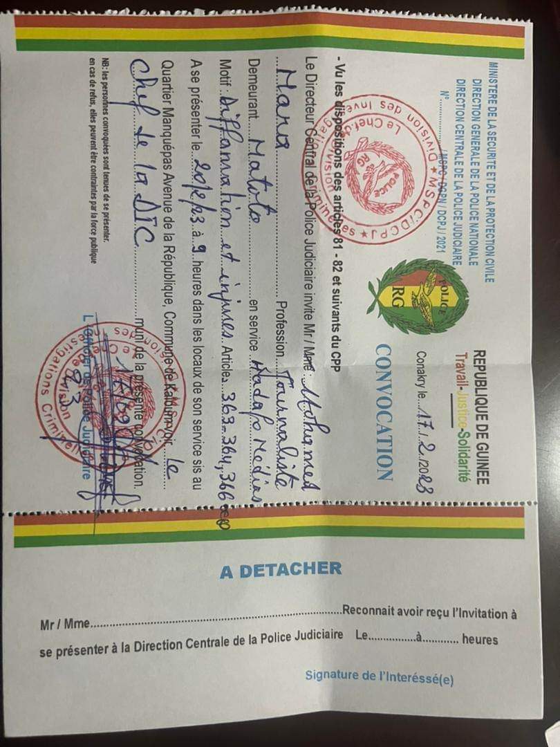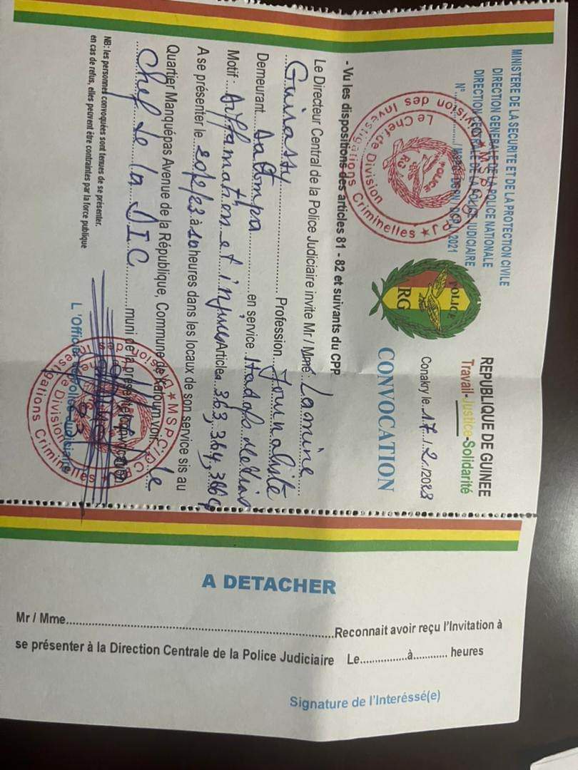 Mohamed Mara, chroniqueur dans les Grandes Gueules du groupe HADAFO Médias et Lamine Guirassy, patron dudit groupe sont invités par le Directeur central de la police judiciaire à se présenter dans les locaux de son service le 20 février 2023, l'un à 9 heures et l'autre à 10 heures.