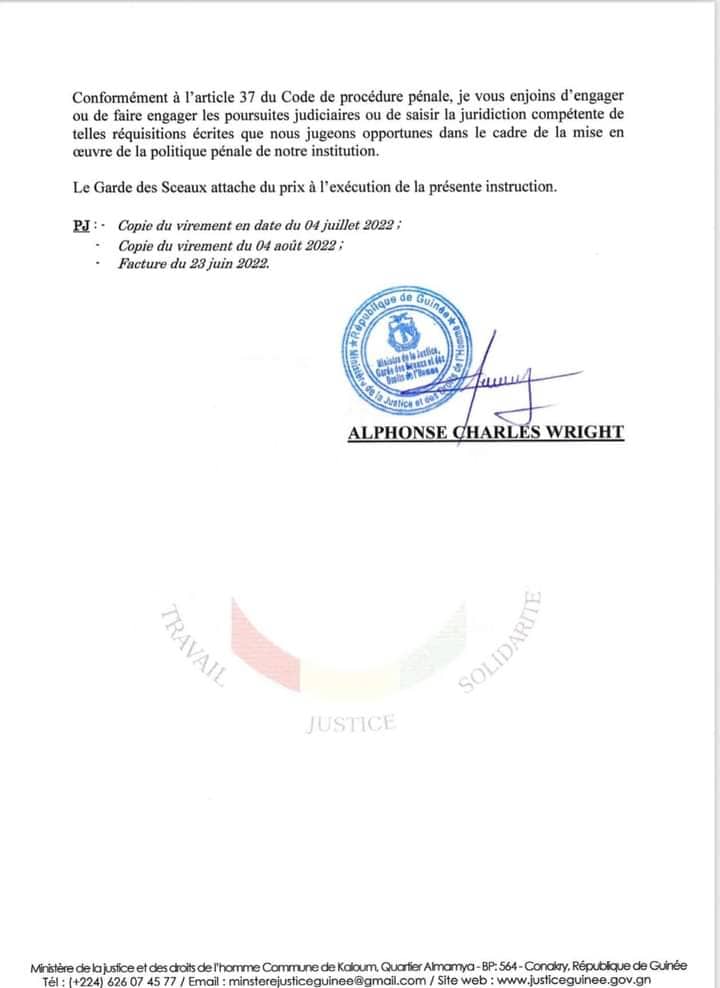 Alors que les premières qui ont fait espérer plus d'un Guinéen quant à la volonté des nouvelles autorités à lutter contre le détournement de deniers publics érigé en mode de gouvernance dans le pays, dorment encore dans les tiroirs du Parquet général de Conakry, le bouillant ministre de la Justice et des droits de l'homme, Alphonse Charles Wright, émet une nouvelle injonction à des fins de poursuites judiciaires contre le DG et un ancien comptable de la Caisse nationale de sécurité sociale (CNSS).