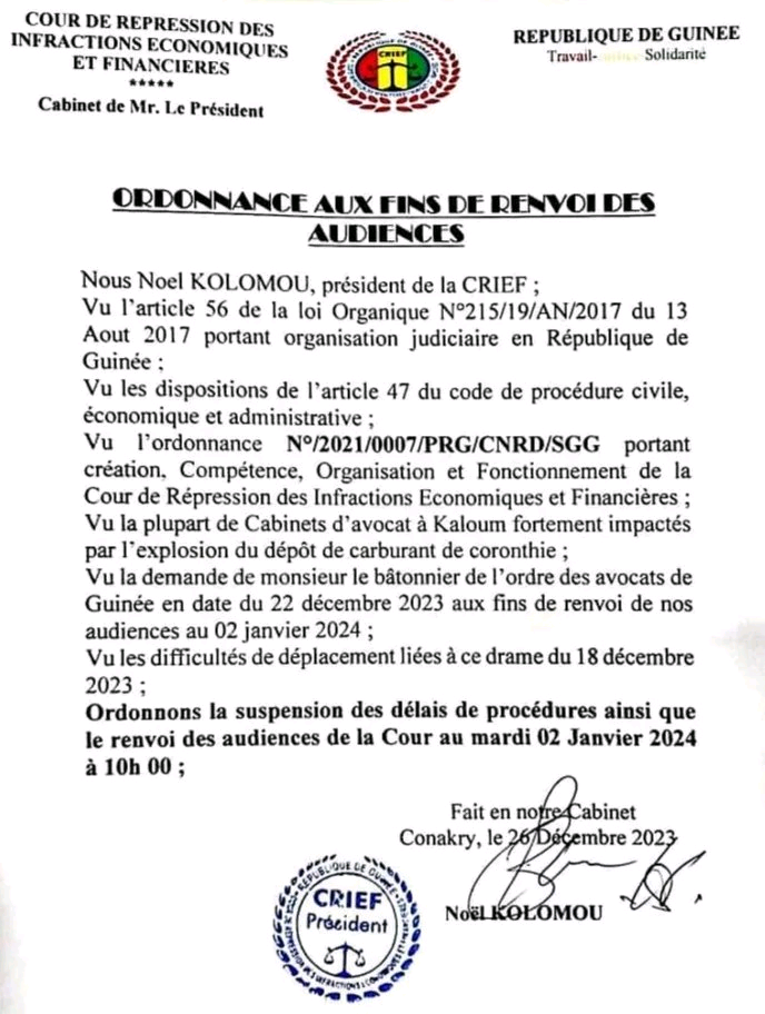 Compte tenu des difficultés que les citoyens de Conakry éprouvent à se déplacer depuis l'explosion suivie de l'incendie de son terminal pétrolier, notamment, le président de la cour de répression des infractions économiques et financières (CRIEF) a décidé le mardi 26 décembre 2023, de renvoyer toutes ses audiences au mardi 02 janvier prochain.