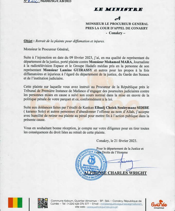 Le garde des Sceaux, ministre de la justice et des droits de l'homme a retiré sa plainte pour diffamation et injures contre les journalistes Mohamed Mara et Lamine Guirassy. Ce qui met automatiquement fin à l'action publique dans cette affaire qui défraie la chronique dans la cité.