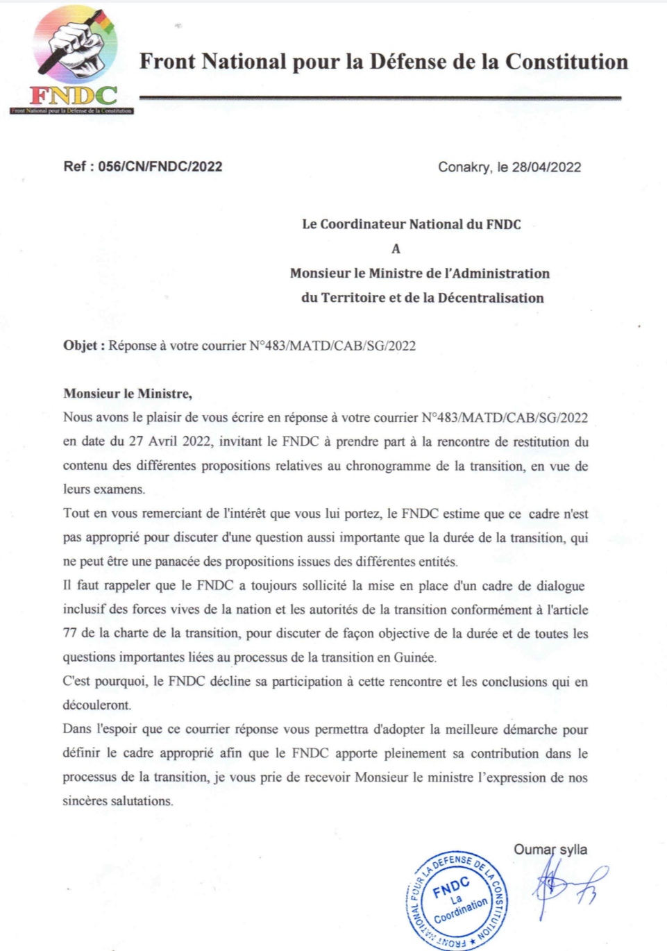 Restitution des propositions de Chronogramme : Le FNDC décline l'invitation du ministre de l'Administration du Territoire
