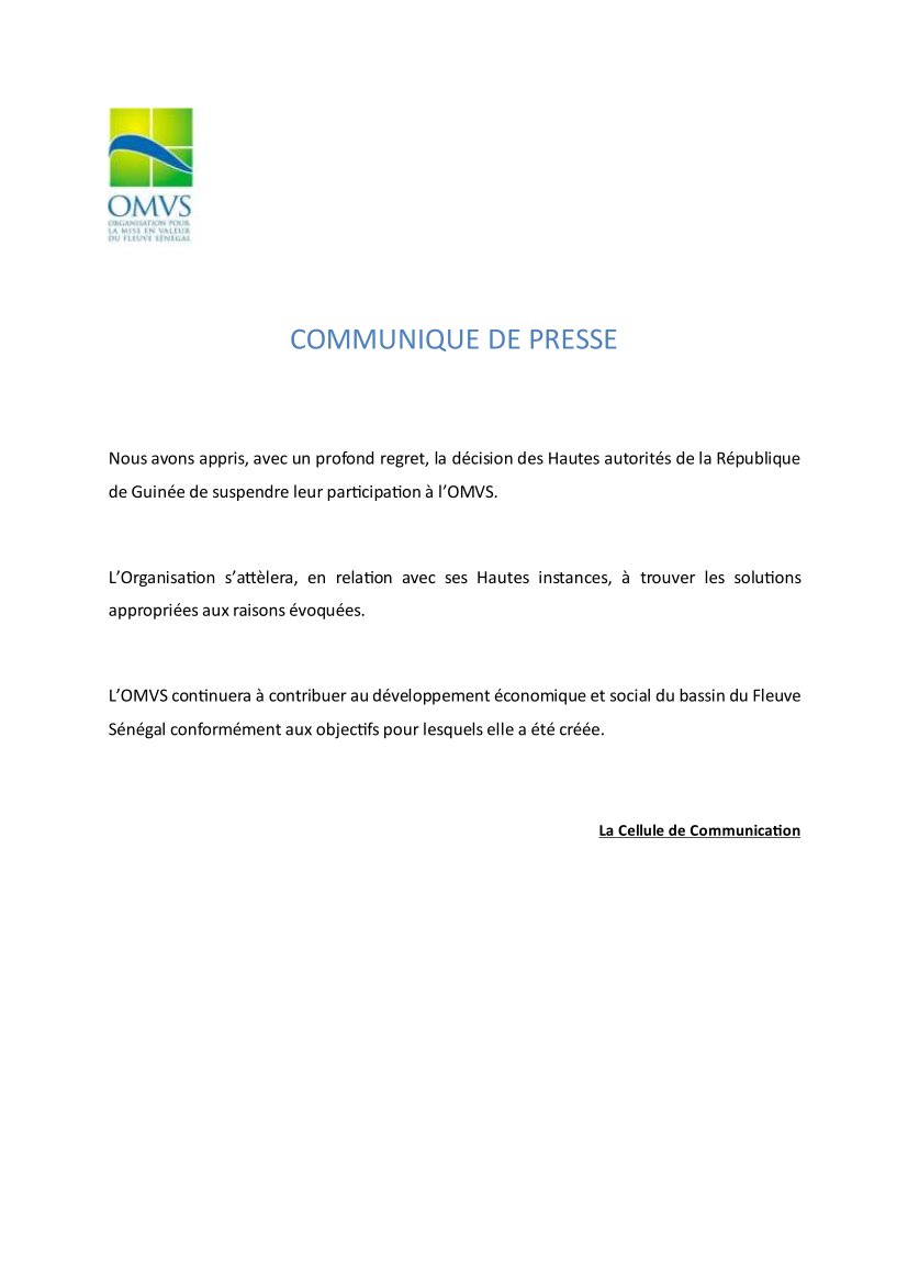 Vingt-quatre heures après la publication de la décision des plus hautes autorités guinéennes de suspendre la participation du pays aux activités de l’OMVS (organisation pour la mise en valeur du fleuve Sénégal), l’organisation annonce qu’elle «s’attèlera, en relation avec ses Hautes instances, à trouver les solutions appropriées aux raisons invoquées».