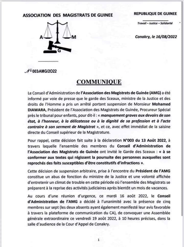 Dans un communiqué publié au lendemain la décision du ministre Charles Wright, le Conseil d'Administration de l'Association des Magistrats de Guinée dénonce "une décision de suspension arbitraire", "un abus de fonction du ministre de la justice et une volonté affichée d'entretenir un climat de trouble" à l'approche de la reprise des activités judiciaires.