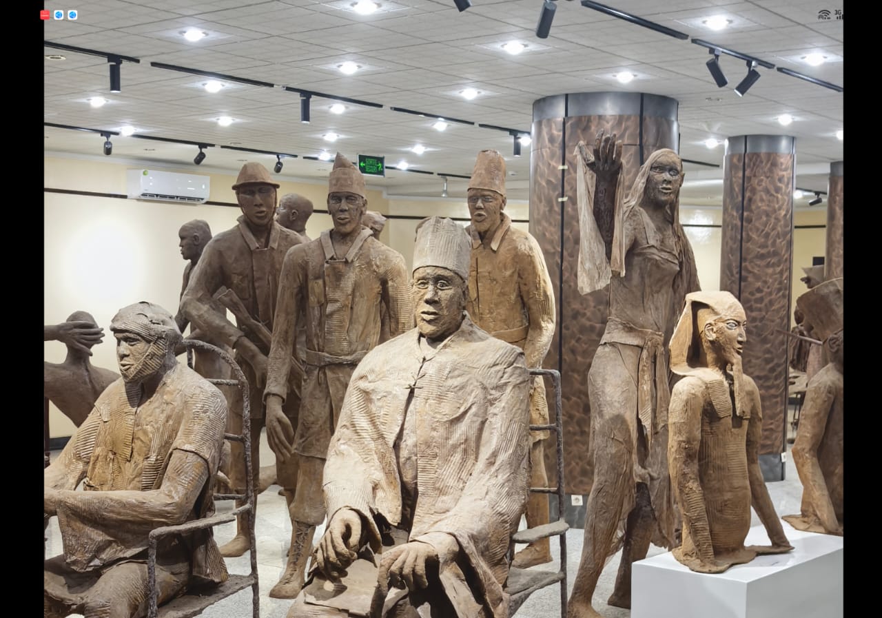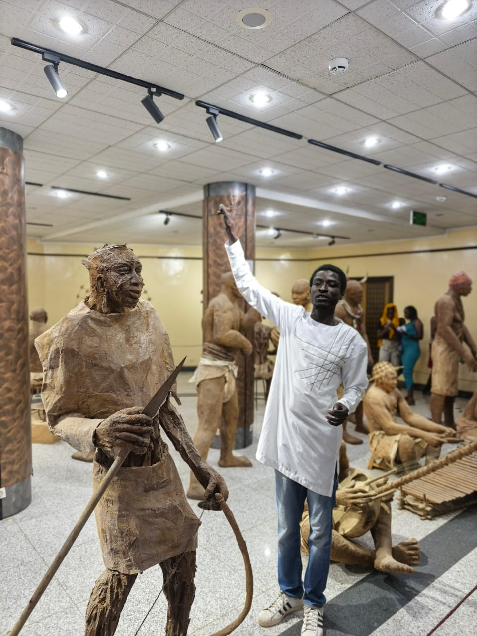 Ensuite, nous avons traversé un couloir qui raconte l’histoire douloureuse de la colonisation en Afrique. Des images, des objets et des témoignages y sont présentés avec respect et émotion. Le sculpteur Djibril Goudiaby a réalisé une partie de cette exposition, divisée en deux sections : l’une dédiée à la mémoire de l’Afrique, l’autre à la famille sénégalaise.