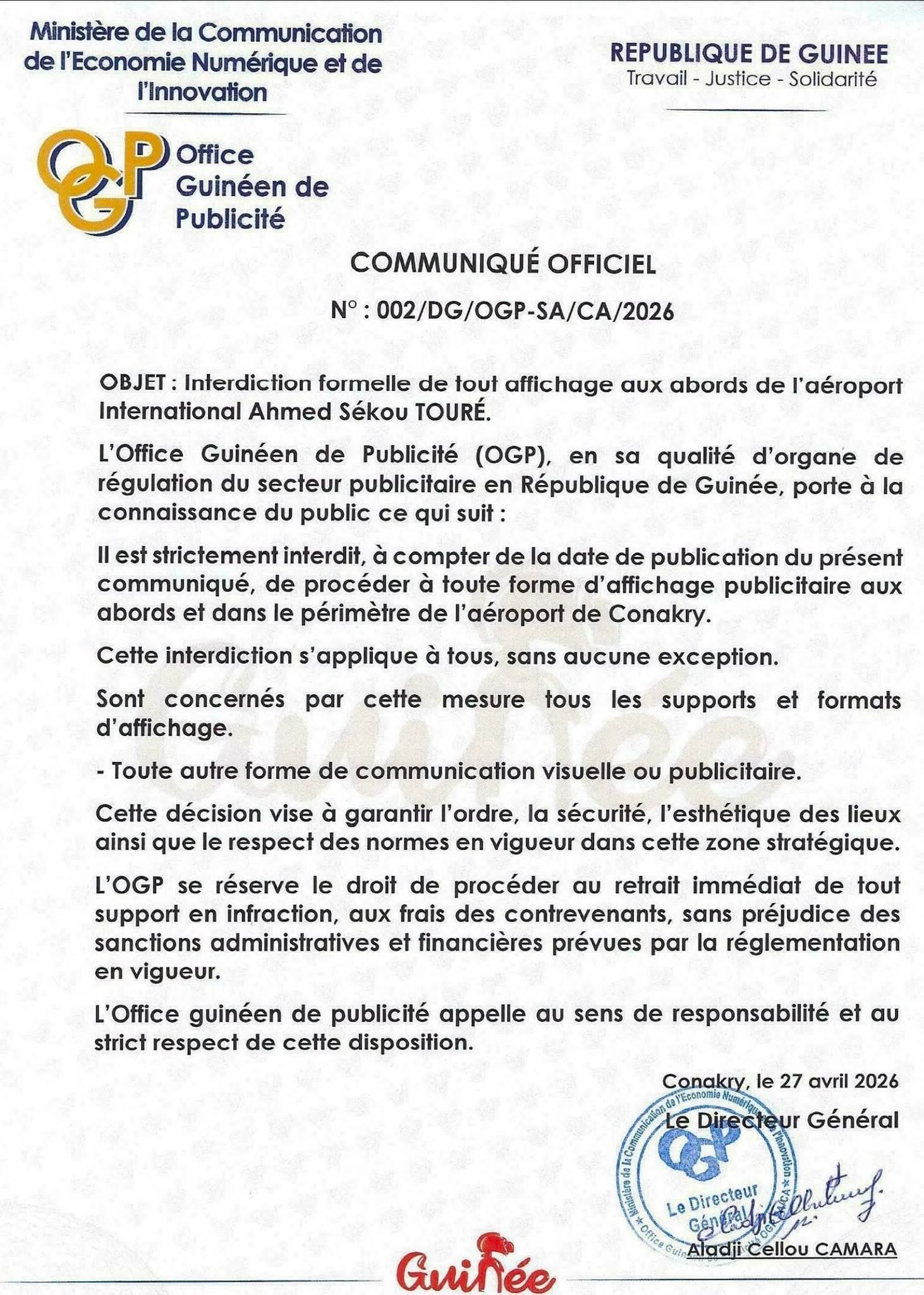 Il est demandé à tous de bien vouloir se conformer strictement aux dispositions de la loi en vigueur régissant les activités publicitaires dans le périmètreet aux abords de l’aéroport international Ahmed Sékou Touré.
