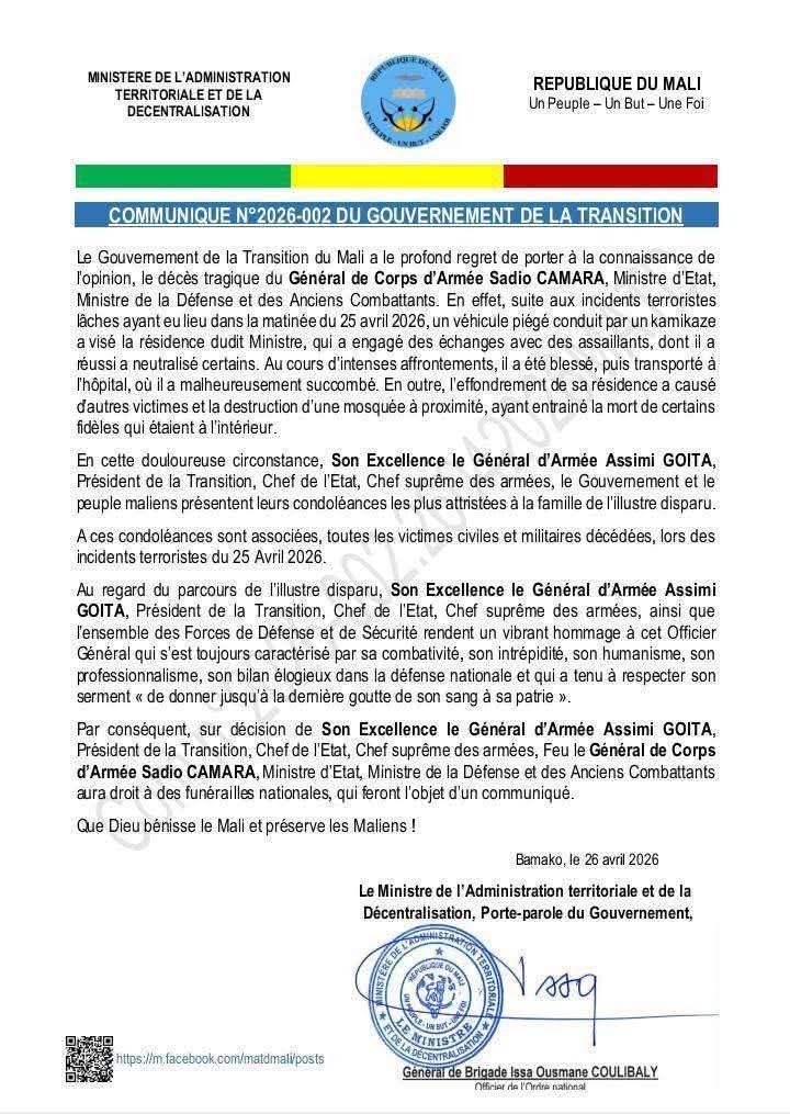 Le Comité Transitoire Civilo-Militaire du Mali informe l’opinion nationale et internationale que, suite aux attaques coordonnées survenues le samedi 25 avril 2026 dans plusieurs localités du pays, le Général de Corps d’Armée Sadio Camara a tragiquement perdu la vie lors d’un attentat perpétré à son domicile de Kati par des éléments du JNIM.