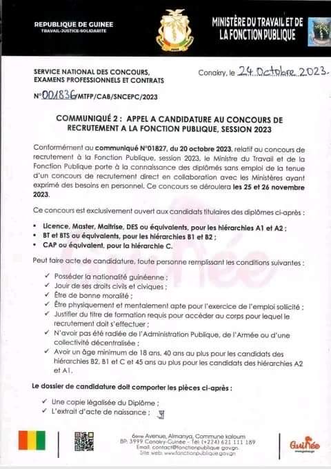 A travers un communiqué, le ministre du travail et de la fonction publique a annoncé le 20 octobre 2023, un concours de recrutement de nouveaux fonctionnaires au compte de quelques départements ministériels.