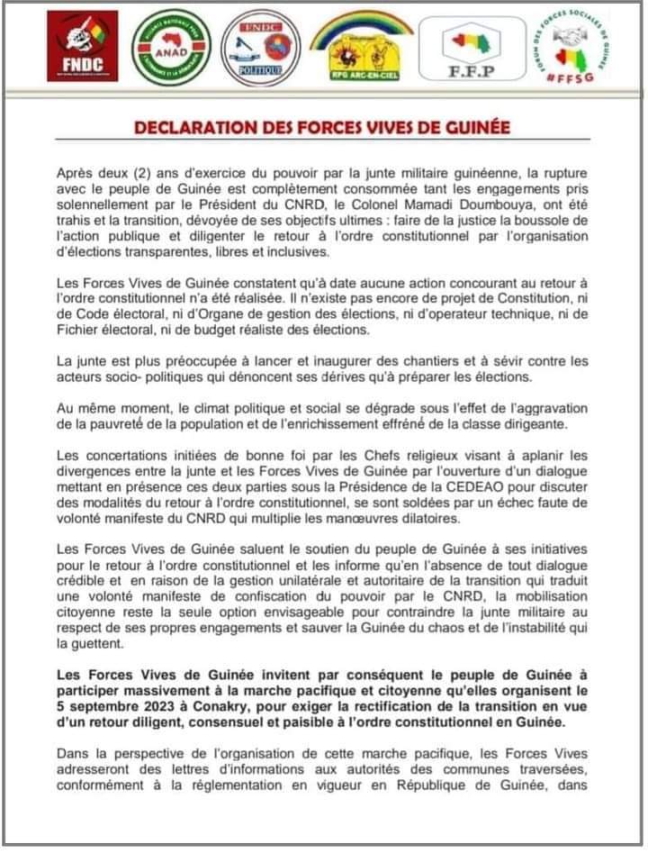 05 septembre 2023: Les Forces Vives invitent le peuple de Guinée à participer massivement à une marche pacifique