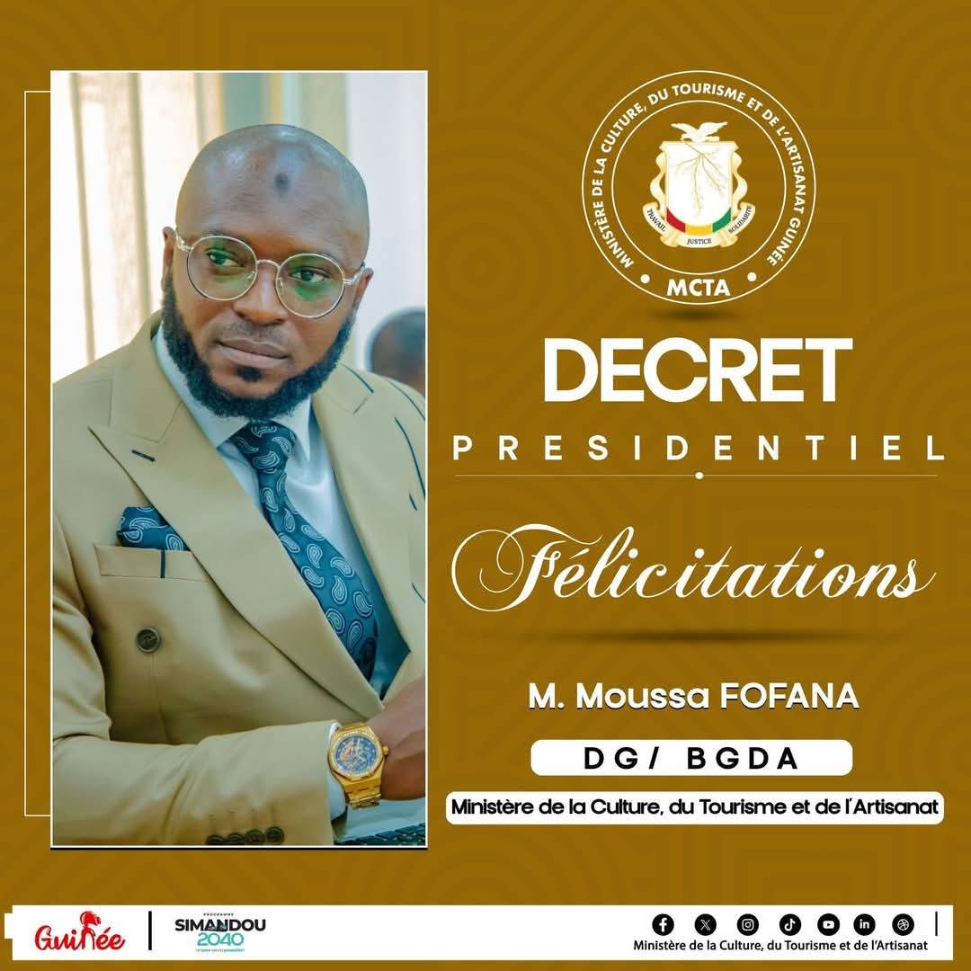 A travers un décret signé le vendredi 17 janvier 2025, le président de la transition, le Général Mamadi Doumbouya, nomme Monsieur Moussa Fofana, Directeur Général du BGDA (bureau guinéen des droits d'auteur).