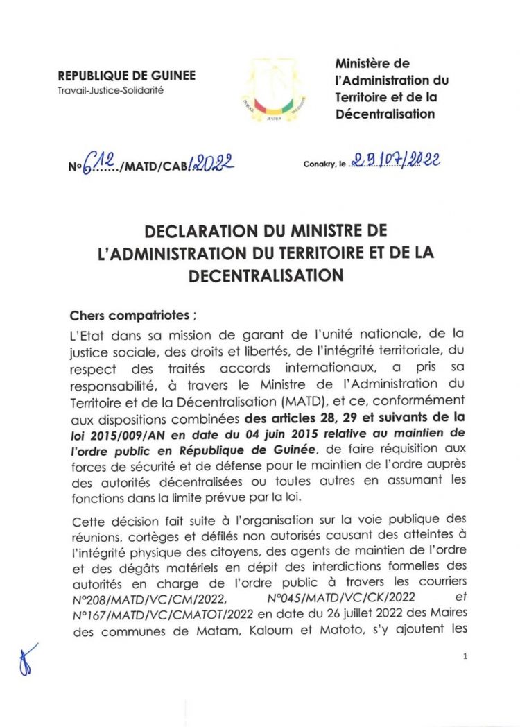 Depuis le mercredi 27 juillet 2022, la banlieue de Conakry et ses environs sont en proie à des scènes de violences qui ont causé des morts, des blessés et d'importants dégâts matériels. Face à cette situation, le gouvernement à travers le ministère de l'administration du territoire et de la décentralisation a fait une réquisition aux forces de défense et de sécurité pour le maintien de l'ordre auprès des autorités décentralisées ou toutes autres assumant les responsabilités.