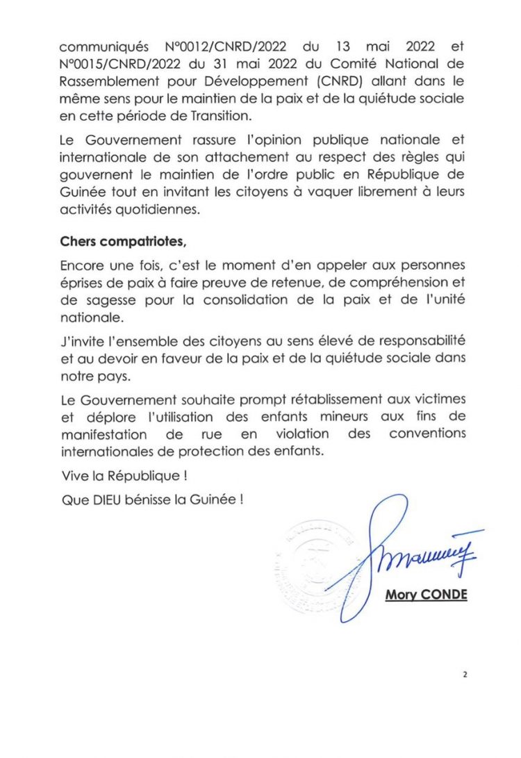 Ci-dessous, la déclaration du ministre Mory Condé.