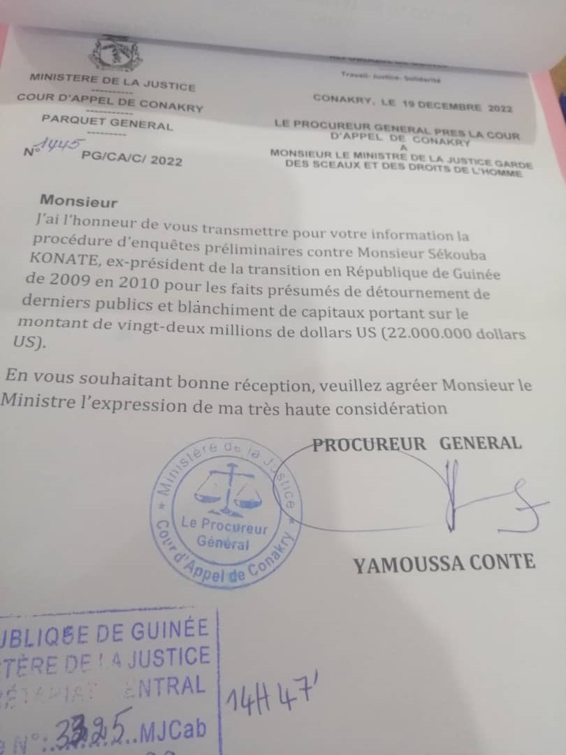 Pour plus d'informations, lire ci-dessous la lettre d'information du Procureur général près la cour d'appel de Conakry adressée au Ministre de la Justice garde des Sceaux et des Droits de l'homme.