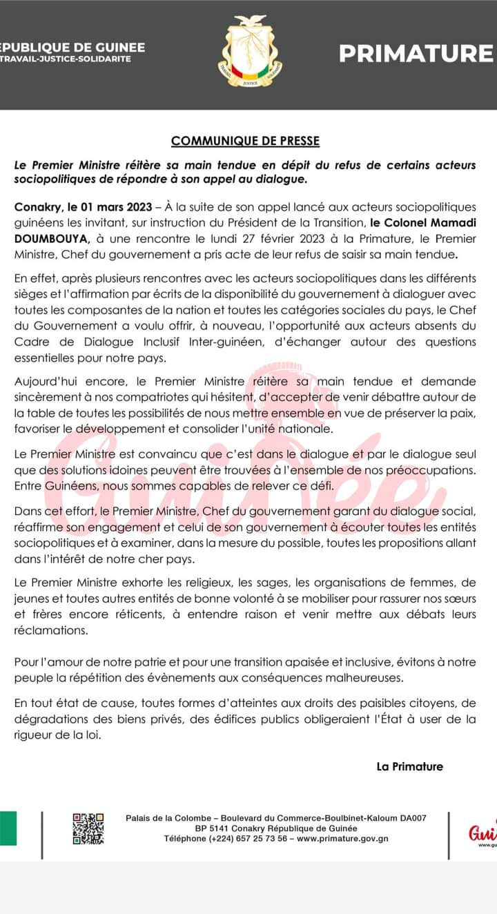 Suite à l'appel des Forces Vives de Guinée à une marche de protestation le jeudi 09 mars 2023, le Premier ministre a invité l'ensemble acteurs sociopolitiques réunis au sein de ce mouvement de fait à une rencontre le mardi 28 février 2023 à la Primature. Contre toute attente, ces acteurs sociopolitiques ont brillé par leur absence.