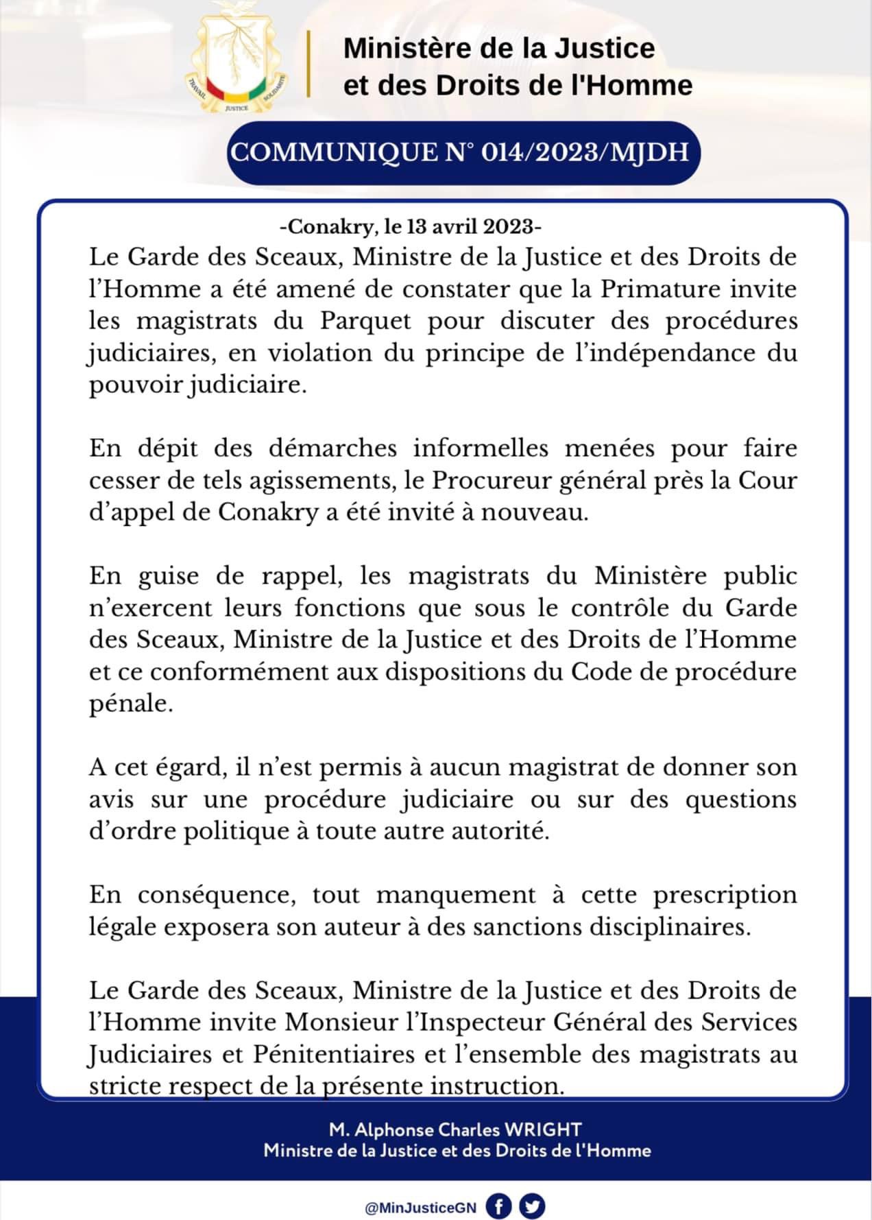 Le garde des Sceaux, ministre de la justice et des droits de l'homme est fâché contre le Premier ministre. Alphonse Charles Wright soupçonne Dr Bernard Goumou de vouloir s'immiscer dans les affaires judiciaires. Il menace de sévir contre tout magistrat qui se prêterait à ce jeu du chef du gouvernement.