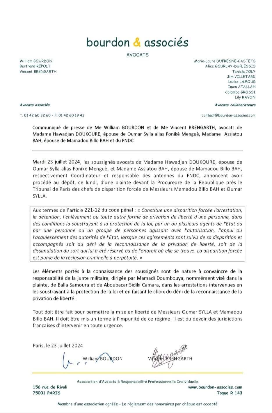 Ladite plainte a été déposée le 22 juillet 2024 par les avocats William Bourdon et Vincent Brengarth. Ces derniers ont été constitués par Hawadjan Doukouré et Assiatou Bah, épouses respectives de Foninké Menguè et de Mamadou Billo Bah. Pour les avocats, les éléments de preuve annexés à la plainte « sont de nature à convaincre de la responsabilité de la junte militaire », dirigée par Mamadi Doumbouya.