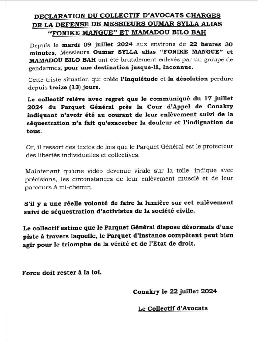 Kidnapping de Fonikè Manguè et Billo Bah : Pour le collectif des avocats, le parquet dispose désormais de piste !