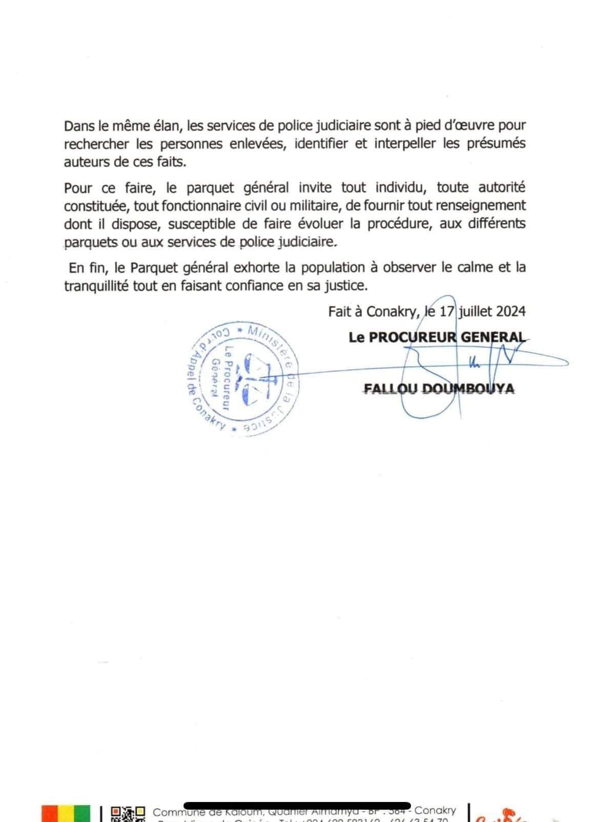 Kidnapping de Fonikè Manguè et Billo Bah : communiqué du Parquet de Conakry