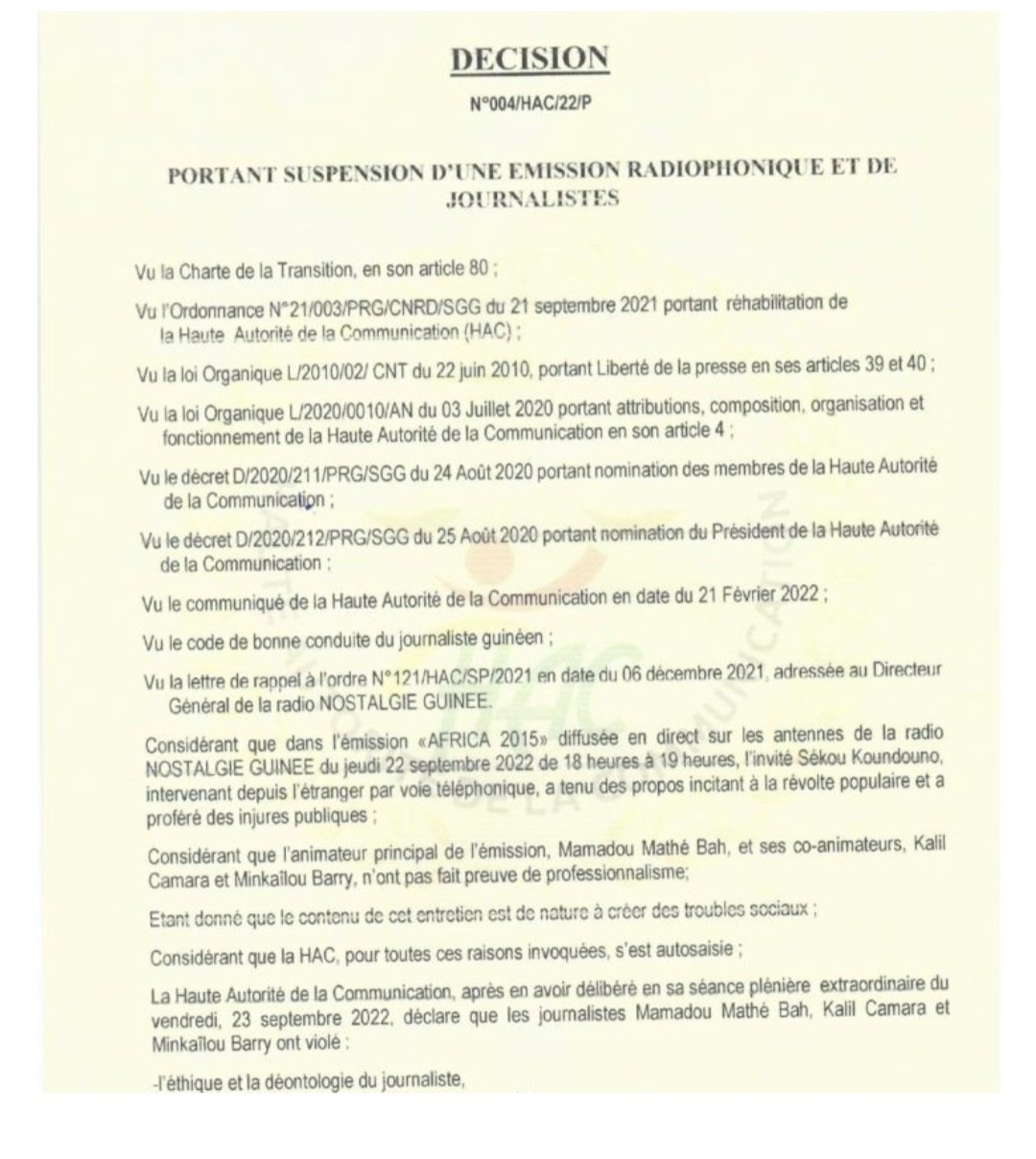 Suite au passage dans l'émission Africa 2015 de la radio Nostalgie Guinée de Sékou Koundouno, responsable des stratégies et planification du FNDC qui "a tenu des propos incitant à la révolté populaire et proféré des injures publiques", le jeudi 22 septembre 2022, la HAC (haute autorité de la communication) ordonne la suspension pour une durée d'un mois allant du 23 septembre 2022 au 23 octobre 2022, la dite émission, son principal animateur et deux de ses collègues.