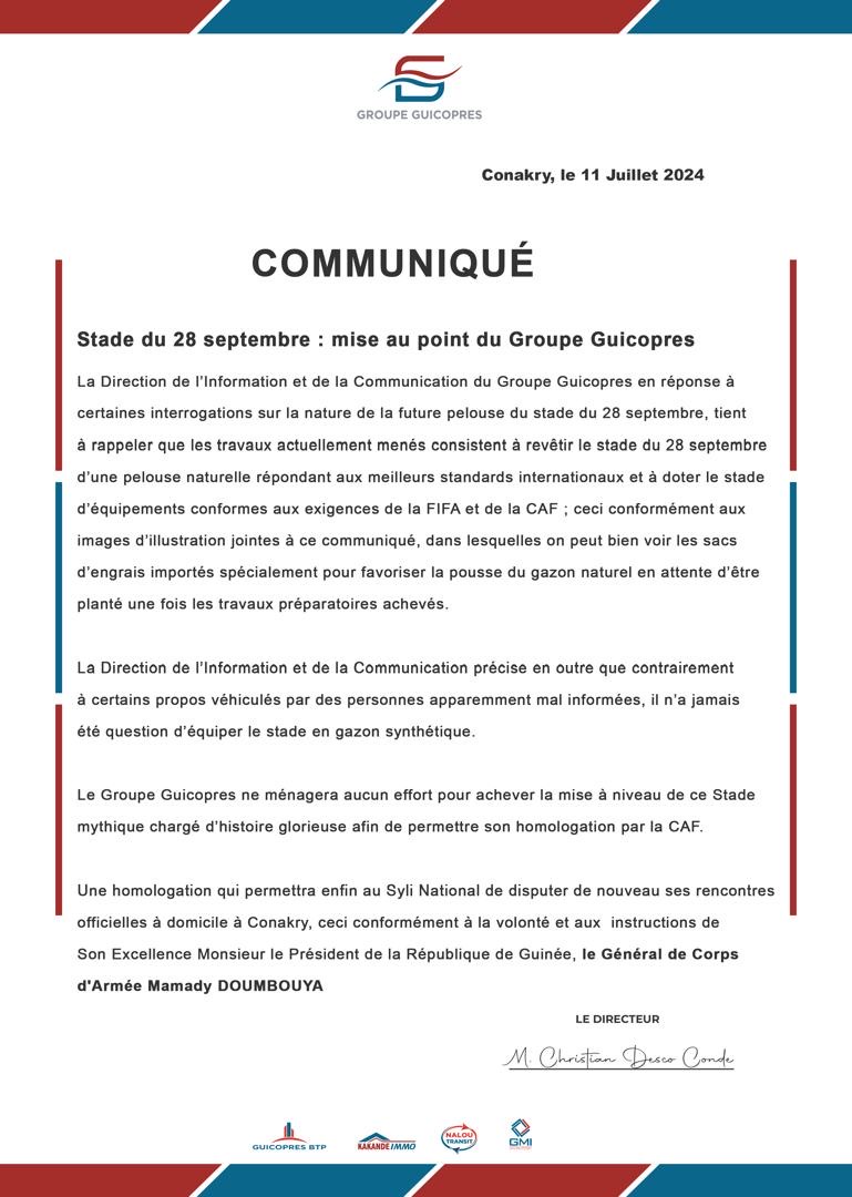 Réhabilitation du Stade du 28 Septembre: Mise au point du Groupe Guicopres